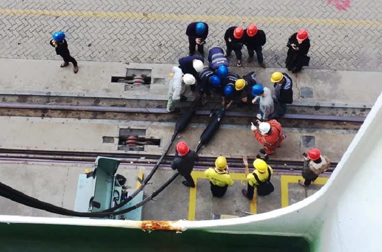 艾臨科(ELECON)岸電事業(yè)部現(xiàn)場技術(shù)人員與長正集裝箱貨輪技師開始正式連船操作。